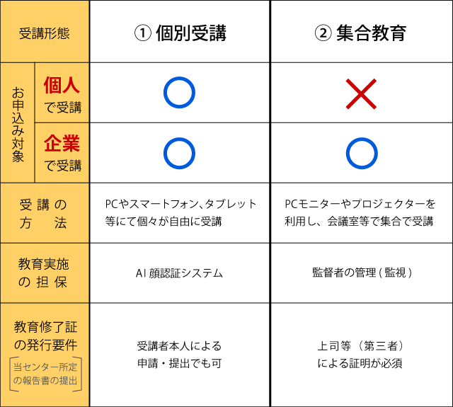 (*1) 教育修了証 【 受講者携帯用 (プラスチックカード) 】 : 労働安全衛生法その他関係諸規定に基づき、受講者の所属事業所が実施する教育の全課程を修了したことを証明するものです。 (*2) 受講証明書 【 事業所保管用 (A4サイズ・証書型) 】 : 労働安全衛生法その他関係諸規定に基づいて事業所が実施する、対象者に対する教育の全課程を修了したことを証明するものです。 |