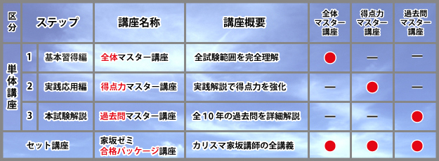 | ● 宅建士 家坂ゼミ合格パッケージ講座 | ・・・ カリスマ家坂講師の全講義 ( 全講義 : 約 104 時間 ) |